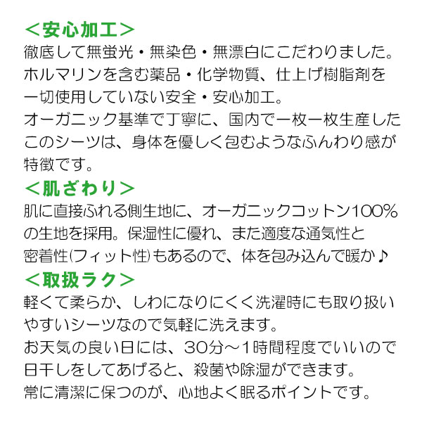 ・原料のオーガニックコットンは加工の段階でも有害化学薬剤は不使用です。